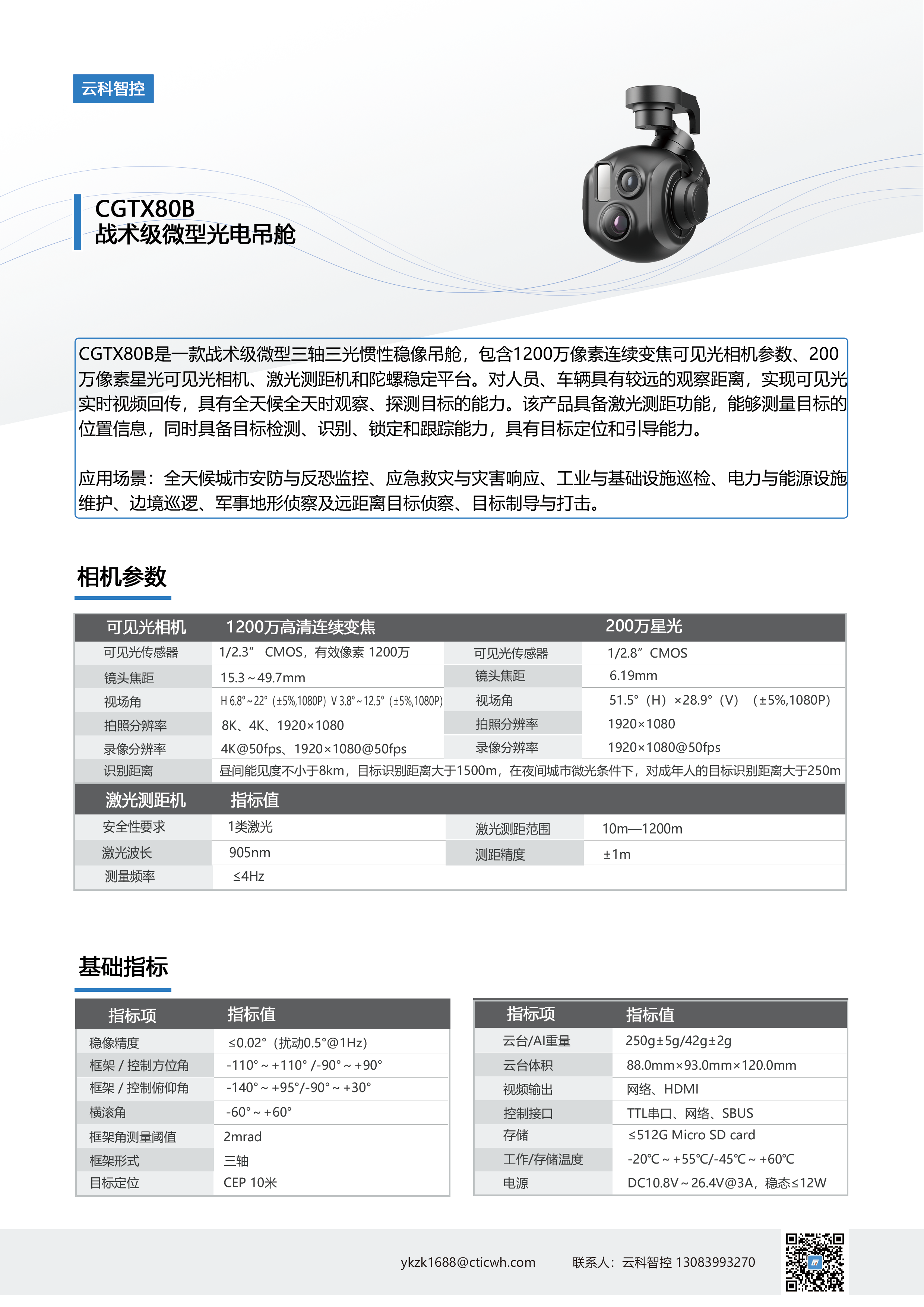 CGTX80B是一款战术级微型三轴三光惯性稳像吊舱,包含1200万像素连续变焦可见光相机参数、200万像素星光可见光相机、激光测距机和陀螺稳定平台。对人员、车辆具有较远的观察距离,实现可见光实时视频回传,具有全天候全天时观察、探测目标的能力。该产品具备激光测距功能,能够测量目标的位置信息,同时具备目标检测、识别、锁定和跟踪能力,具有目标定位和引导能力。